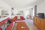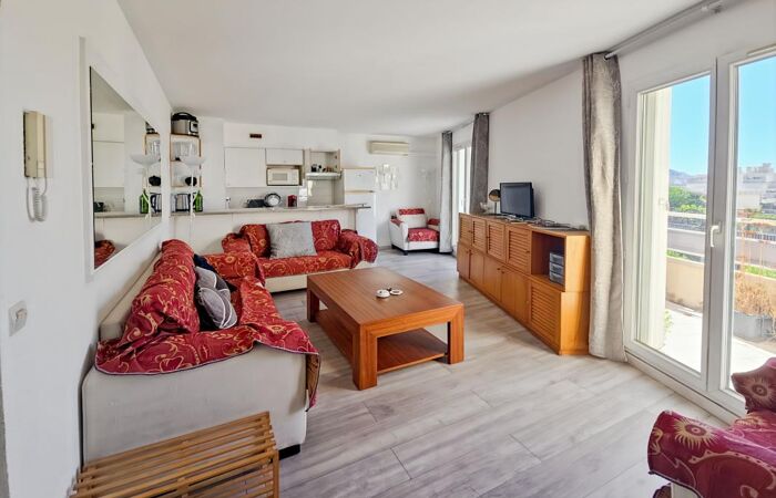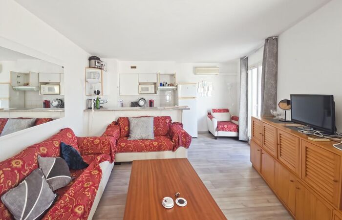 A bright living room with a fully fitted and equipped open-plan kitchen, opening onto a pleasant 8.60 m² terrace,