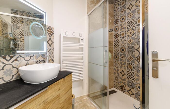 une salle de bains aménagée avec une douche à l'italienne.