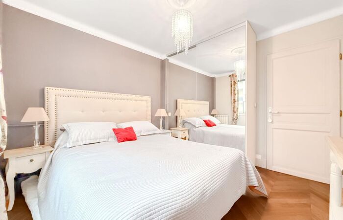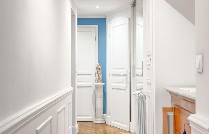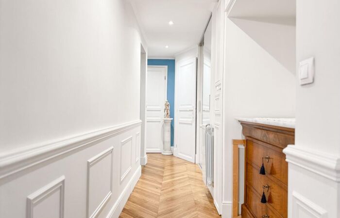 Entièrement rénové avec des matériaux de qualité : parquet massif en point de Hongrie, carreaux de ciment, moulures, boiseries, double vitrage haut de gamme et climatisation.