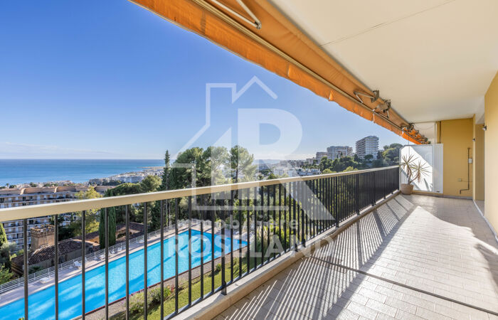 Dans une résidence de standing sécurisée avec piscine et courts de tennis, découvrez cet appartement traversant de 98,18 m2 situé en étage élevé avec ascenseur, offrant une vue mer panoramique exceptionnelle sur la Baie des Anges. 2 terrasses de 32m2 au total + cellier de 2.55m2. Double exposition: Nord-Sud.L’appartement se compose actuellement de 2 chambres et d’un vaste séjour de 40.20 m2 ouvrant sur une terrasse plein sud avec vue mer imprenable.Il est possible de transformer le plan pour obtenir un séjour de 27.50 m2 avec 3 chambres, selon les besoins. L'appartement possède une salle d'eau,une salle de bains avec wc et un wc indépendant.Nombreux rangements.Cave et Garage. TRAVAUX à prévoir.