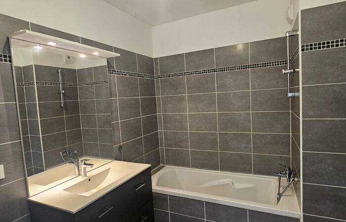 Comprenant : une entrée avec placard, un séjour / cuisine de 23,50 m2, une chambre de 11 m2, une salle de bains et un WC individuel. Lumineux. Calme.