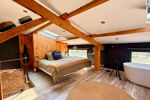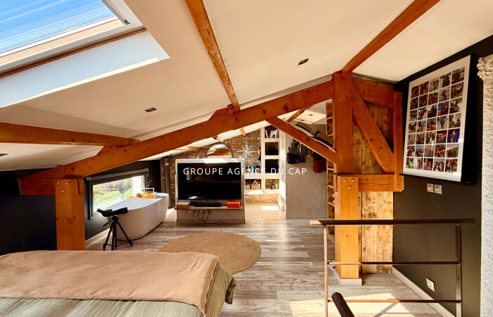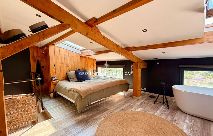 À l'étage, une suite parentale bénéficie d'une salle de bains, d'un dressing et d'un espace bureau mansardé avec vue imprenable.