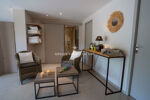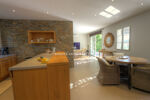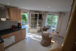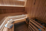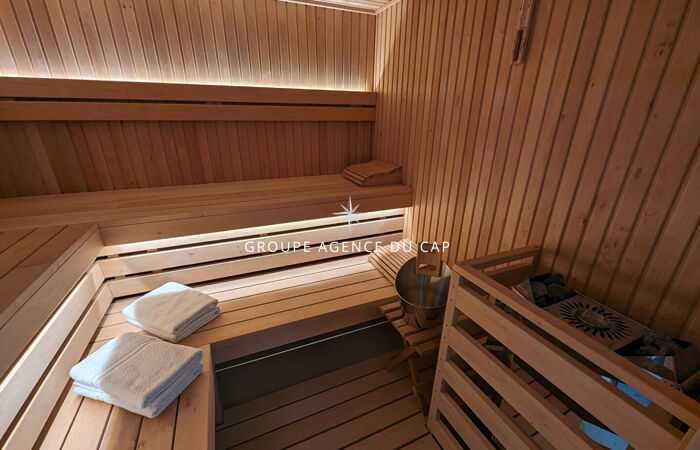 En rez-de-jardin, un aménagement a été pensé avec sauna / hammam, cuisine américaine et douche.