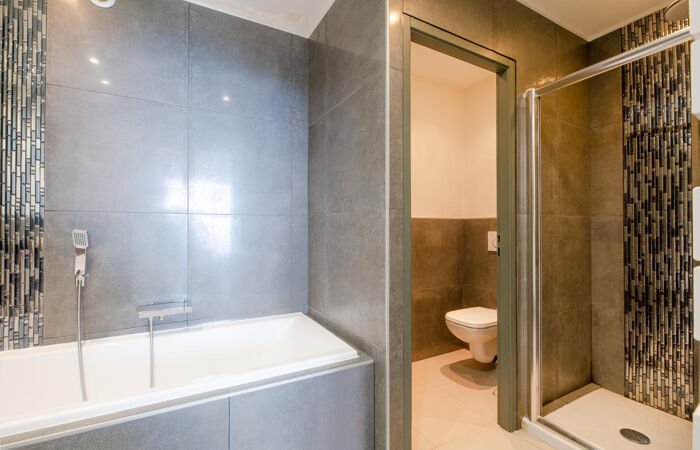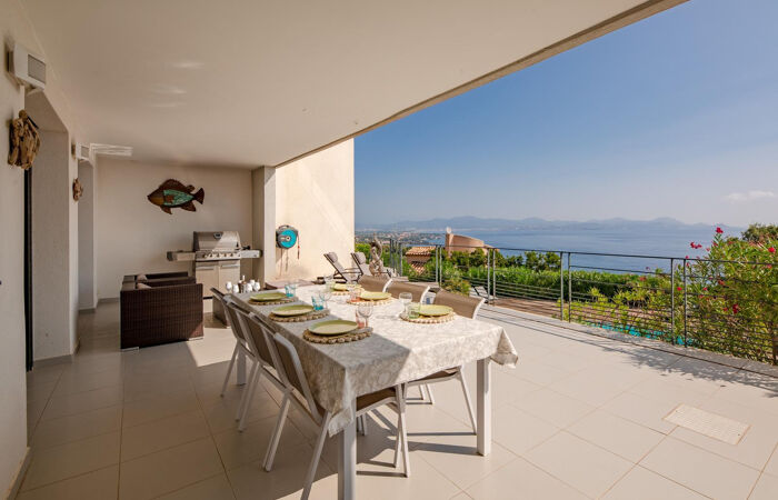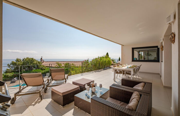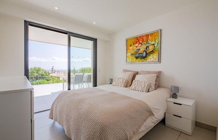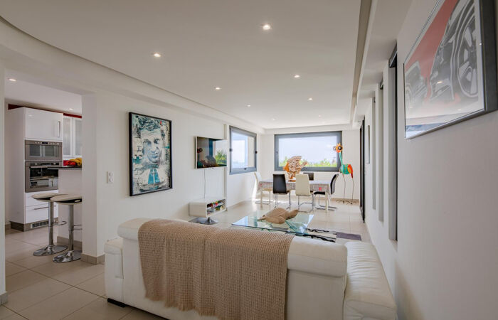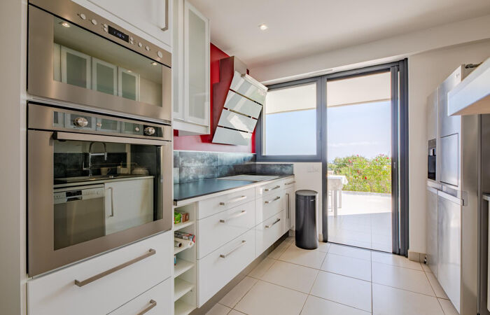 L'appartement comprend un séjour, une cuisine moderne entièrement équipée et aménagée, une buanderie, des toilettes invités, ainsi qu'une chambre en suite avec salle de douche et toilettes, et une autre chambre avec une salle de douche séparée. Chaque pièce s'ouvre sur de vastes terrasses et un jardin face à la mer. (possibilité de créer un 3ème espace nuit)