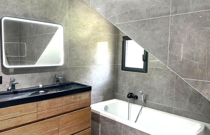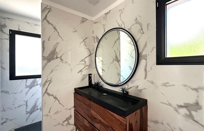 Cette villa offre de belles prestations telles que des baies vitrées en aluminium double vitrage, volet roulant, alarme, une climatisation réversible gainable et un boulodrome.