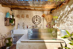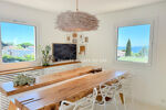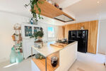 Dès l'entrée, la cuisine moderne séduit par ses lignes épurées et son espace repas baigné de lumière. Elle s'ouvre sur une terrasse accueillante où trône une cuisine d'été parfaitement équipée, idéale pour prolonger les soirées d'été.