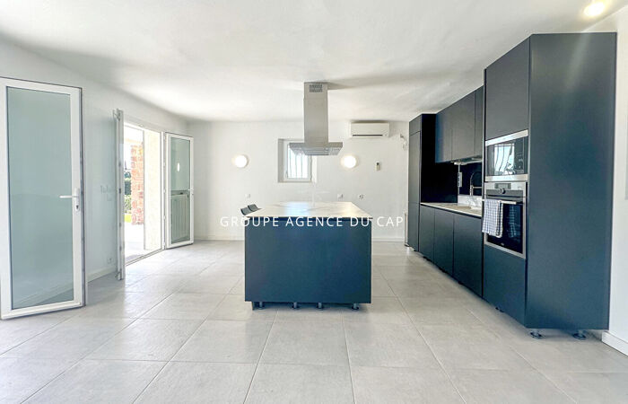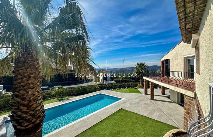 Elle est composée de deux appartements communiquant par l'intérieur. Le rez-de-jardin, entièrement rénové, dispose de trois chambres, deux salles d'eau, deux WC, et une cuisine équipée, le tout donnant sur une grande terrasse avec accès direct à la piscine. À l'étage, entièrement rénové également, un vaste séjour s'ouvre sur une terrasse et une véranda exposée plein SUD avec vue sur la mer, une cuisine indépendante avec accès extérieur, deux chambres, et une salle de douche.