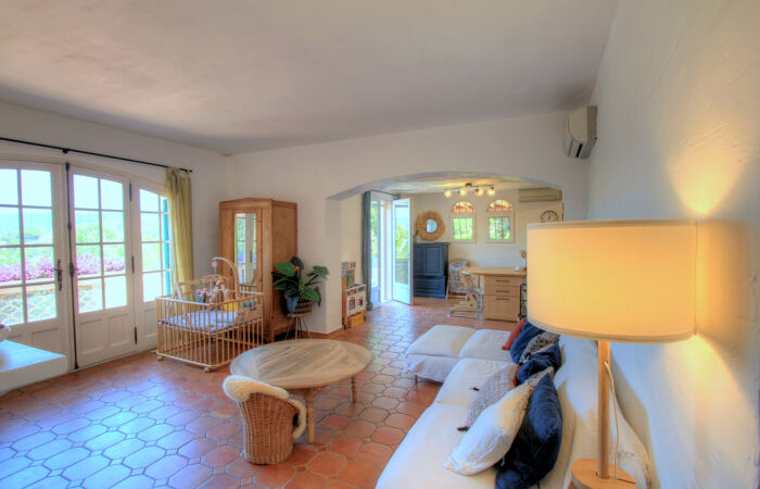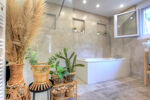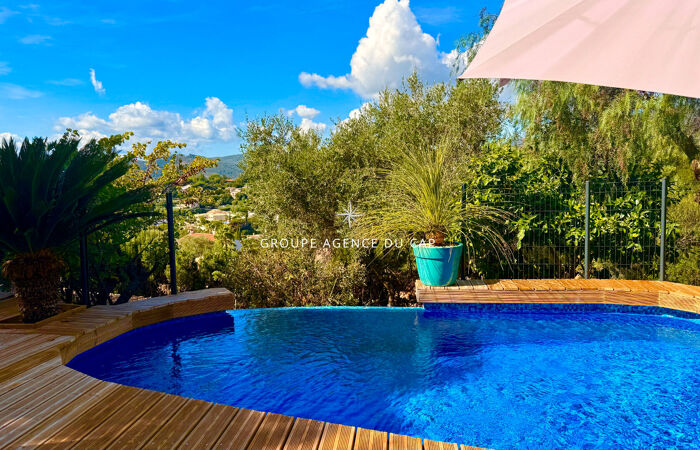 Le terrain paysagé de 2000 m² offre une ambiance tropicale avec un espace piscine où se prélasser .