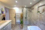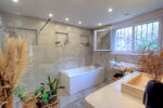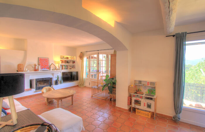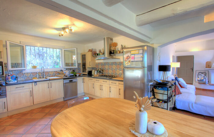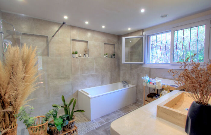 A l'étage, un lumineux 4 pièces avec veranda et coin barbecue, un espace de vie avec cuisine et sejour cheminée, 2 chambres, une salle de bain complète.