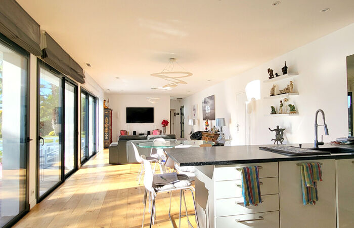 Toutes les pièces offrent de larges baies vitrées toutes exposées au sud assurant un ensoleillement maximum. La villa est équipée de la climatisation , d'une alarme et d'une domotique de pointe. Parfait état intérieur.