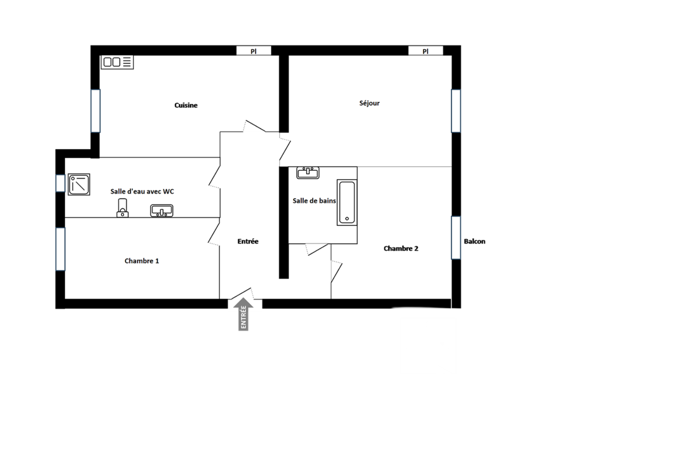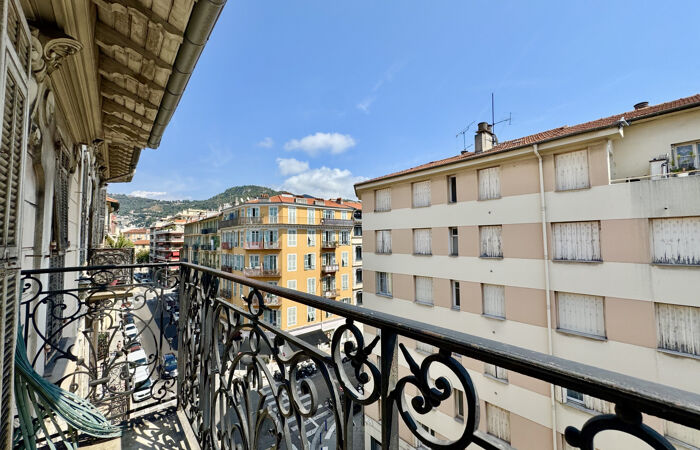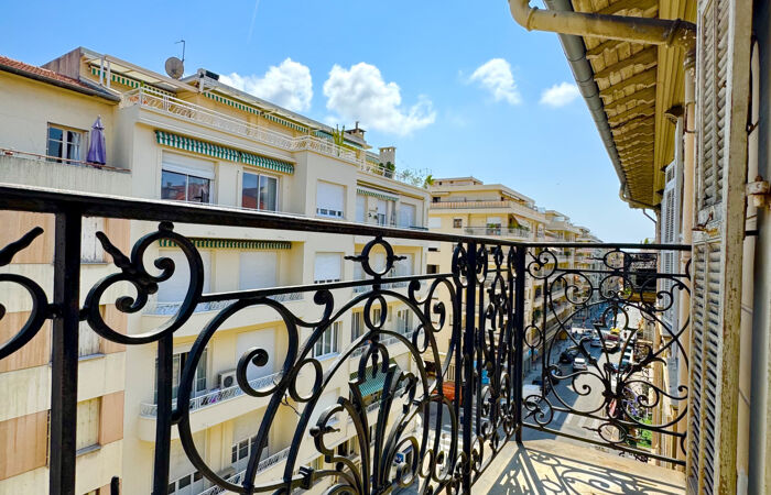 Cet appartement traversant EST/OUEST est composé d'une entrée, deux chambres, un séjour avec cheminée, une cuisine séparée, une salle de bains, une salle d'eau avec WC et un balcon.