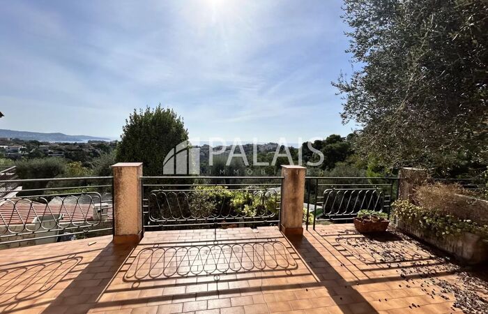 Une cuisine ouverte, un séjour donnant sur une terrasse avec une vue panoramique sur la mer.