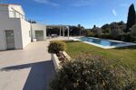 Les extérieurs ont été soigneusement aménagés avec un jardin paysager, une piscine aux lignes épurées, une pergola bioclimatique aménagée en salon d'été, ainsi que plusieurs espaces de stationnement, dont une grande place couverte.