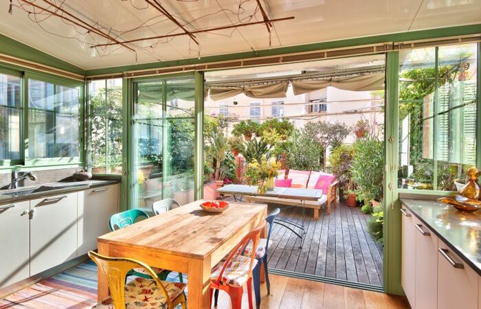 Cet appartement se compose d'un séjour prolongé par une cuisine sous une très belle véranda qui s'ouvre entièrement sur une terrasse aménagée, l'ensemble de ces pièces offre un espace de vie de 52m² baigné de lumière.