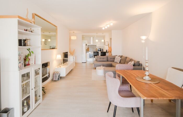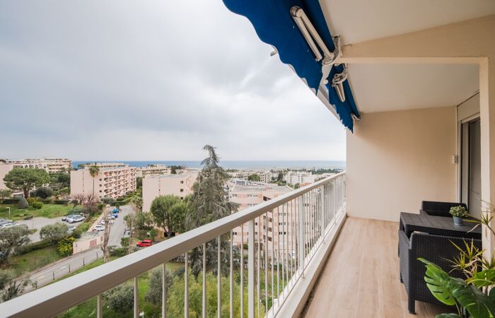 L'appartement se compose d'un grand séjour avec cuisine aménagée et équipée, ouvrant sur une agréable terrasse d'environ 14 m² offrant une très belle vue dégagée sur la mer.
