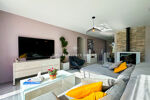 De plain-pied, la maison offre un spacieux séjour double de 65 m² avec cuisine américaine entièrement aménagée et équipée, baigné de lumière et ouvert sur l'extérieur.
