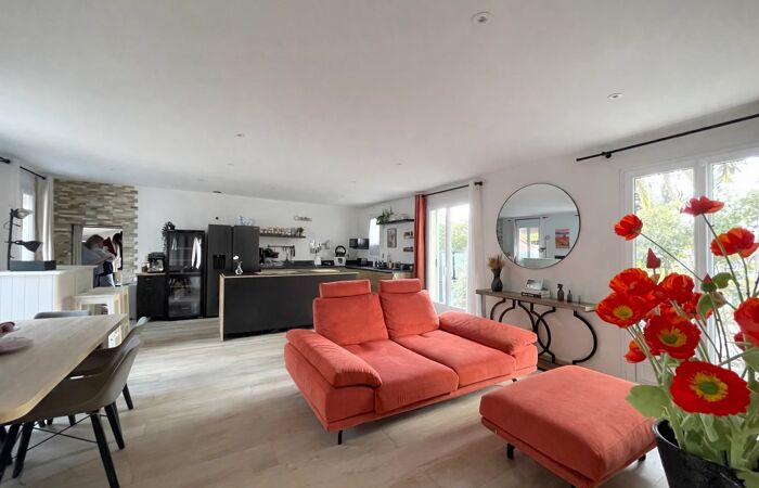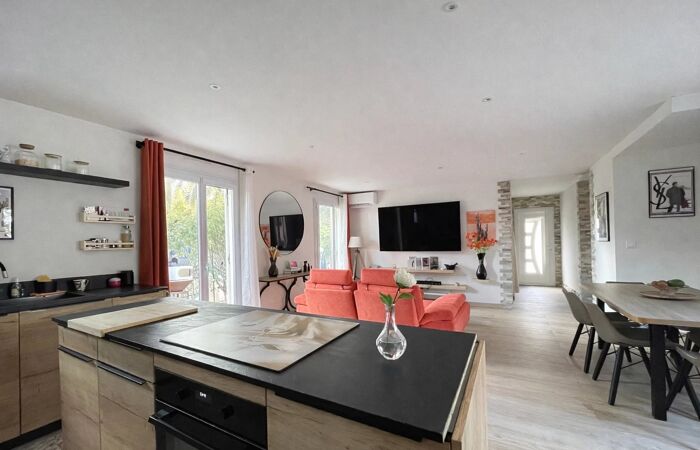La maison offre un spacieux séjour / salle à manger, idéal pour les moments en famille ou entre amis, ouvert sur une magnifique cuisine équipée et aménagée, fonctionnelle et contemporaine.