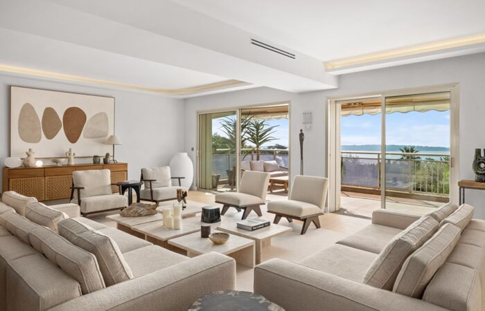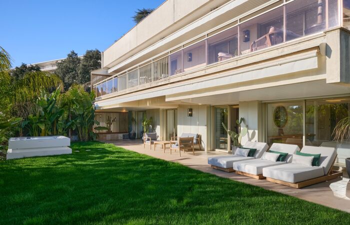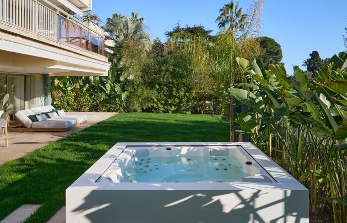 Les extérieurs sont tout aussi remarquables : terrasses à chaque niveau, jardin paysager avec jacuzzi, et une vue mer panoramique spectaculaire sur la baie de Cannes.