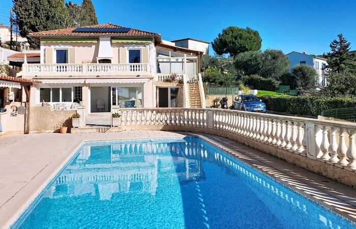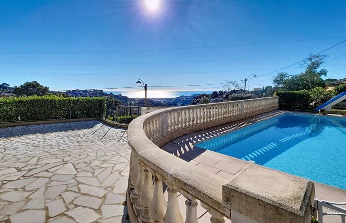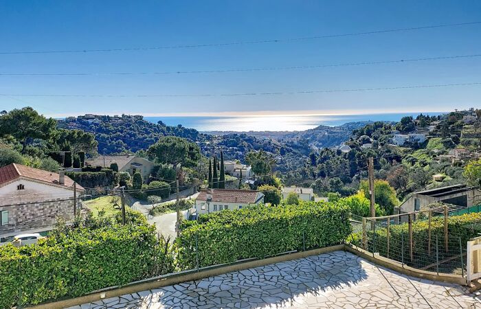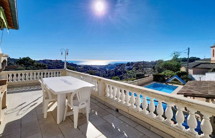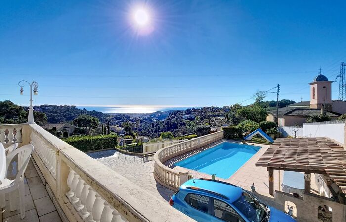 NICE-ST PANCRACE MAISON 6 PIECES PISCINE TERRASSES PARKINGS Maison avec vue mer de 152m² habitable, idéalement située à seulement 10 minutes de la Clinique Saint-Georges et de l'accès A8 Nice Nord. Actuellement configurée en deux appartements F3, elle bénéficie d'une exposition plein sud qui baigne les pièces de lumière et valorise son panorama.