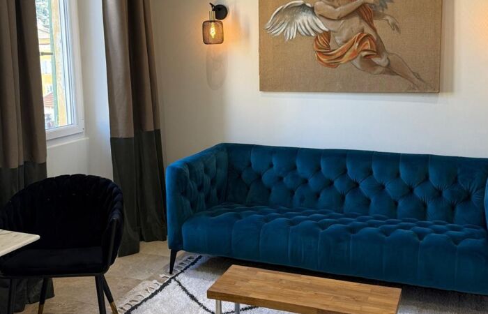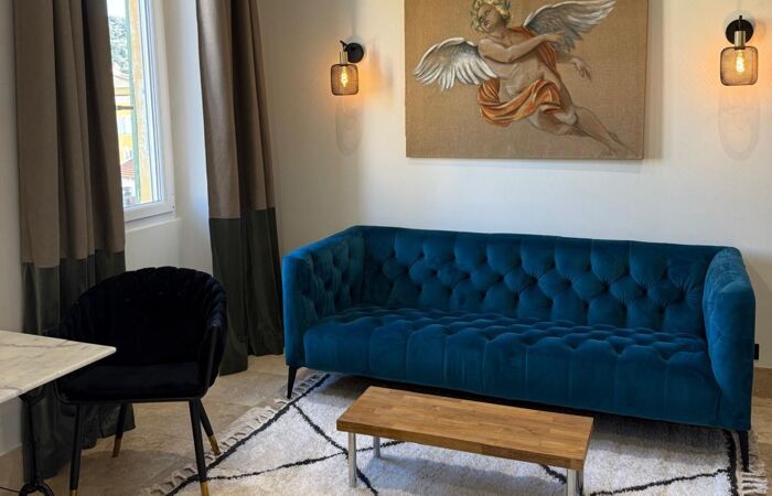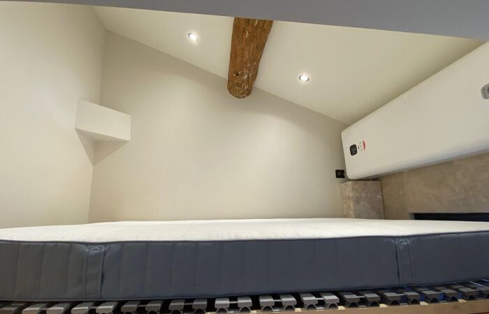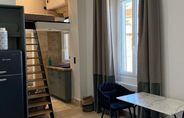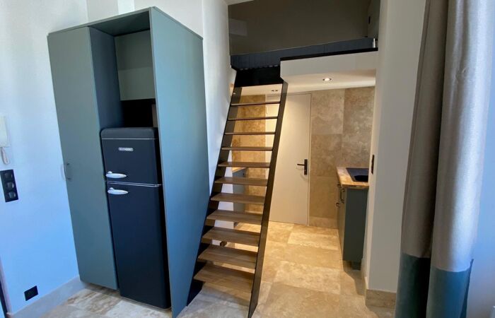 Joli studio meublé avec mezzanine, situé au 4ème et dernier étage sans ascenseur, entièrement rénové avec gout et climatisé, disponible en location longue durée, libre immédiatement.