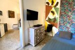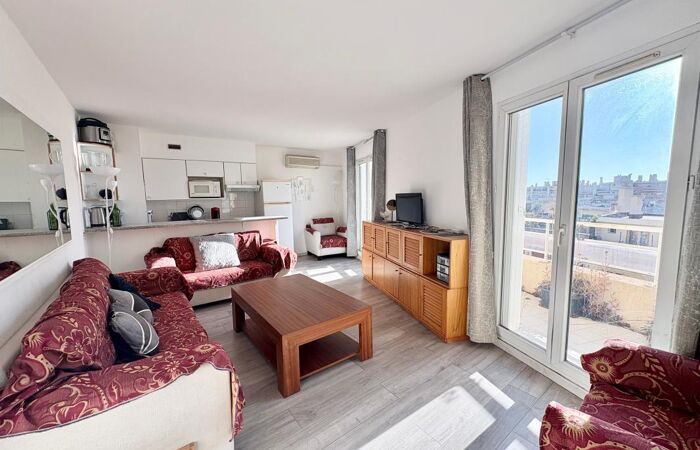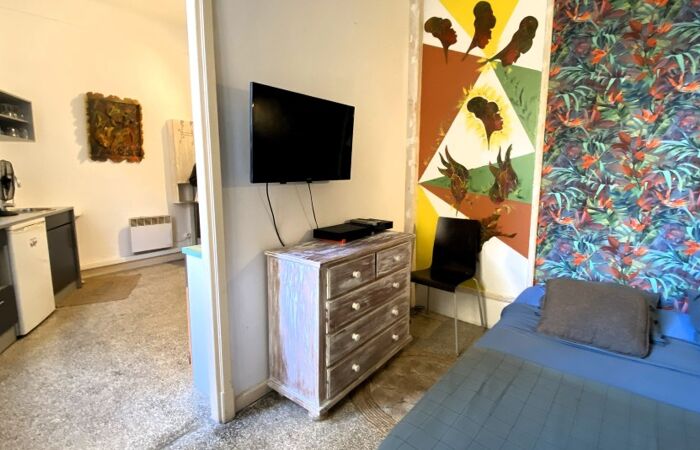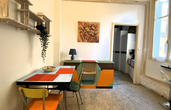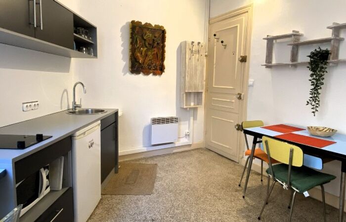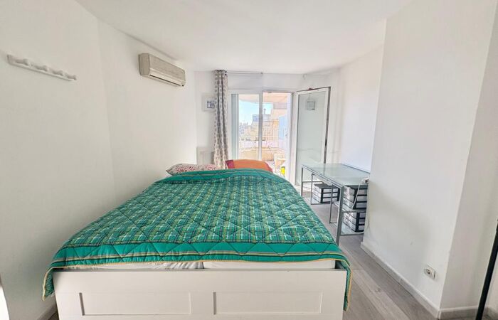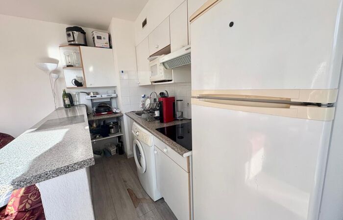 L'appartement se trouve au 7ᵉ étage avec ascenseur et se compose d'un séjour lumineux avec cuisine ouverte, entièrement aménagée et équipée (plaques de cuisson, hotte, lave-linge, réfrigérateur, micro-ondes), donnant sur une agréable terrasse, une chambre donnant sur un second balcon, une salle de bain avec WC.
