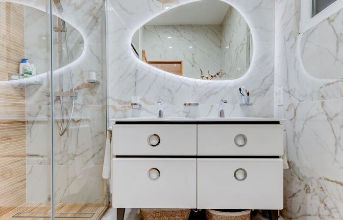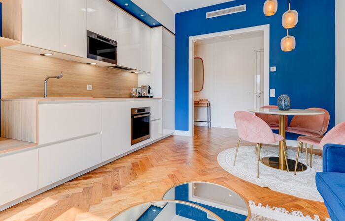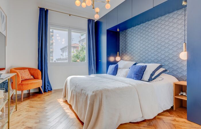 Ce magnifique appartement est composé d'un séjour de plus de 60 m² ouvrant sur une grande et agréable terrasse de 80 m² avec jacuzzi, surplombant la baie des anges, d'une chambre de maitres de 38 m², de deux chambres dont une en mezzanine et d'un appartement d'invités indépendant. Trois salles de douches, un grand dressing, une cave climatisée et des plafonds de plus de 5 mètres de haut avec fresques.