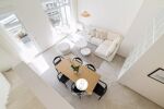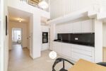 Une entrée ouvrant sur un séjour cathédrale avec cuisine ouverte entièrement équipée, donnant accès à une terrasse de 12m².