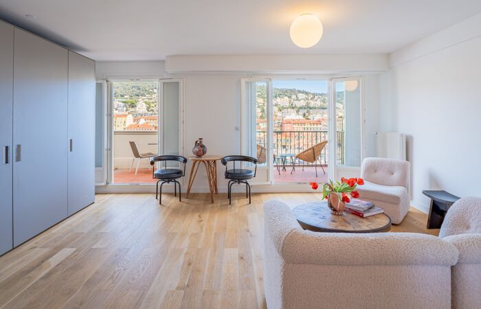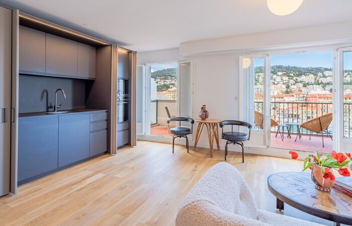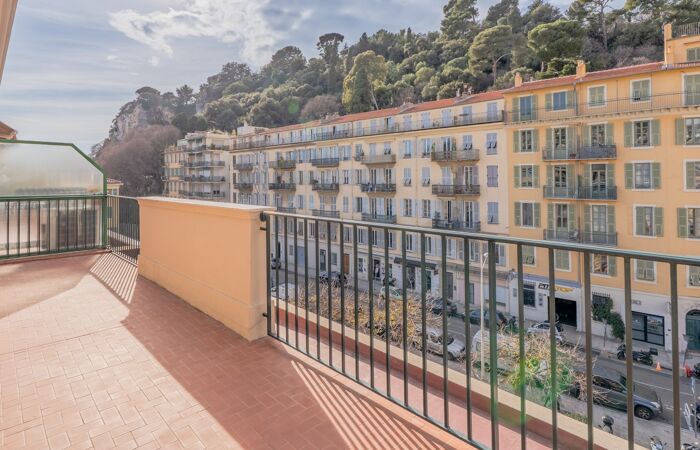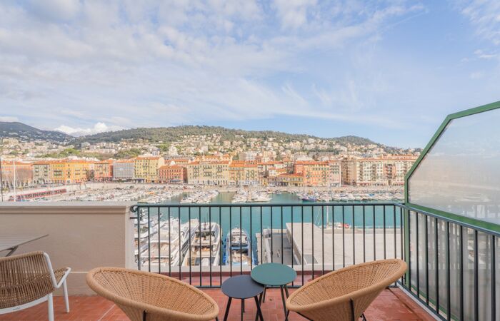 Nice Port - En dernier étage d'une résidence récente de grand standing, idéalement située sur le Port de Nice, superbe appartement de type 3 pièces de 67 m² offrant une vue exceptionnelle sur la mer et le port de Nice. Traversant et entièrement rénové, il bénéficie de près de 27 m² de terrasses.