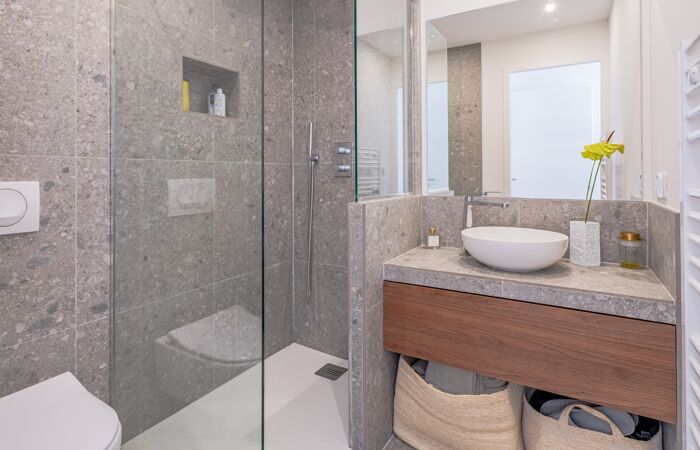 La partie nuit, orientée Ouest, se compose de deux chambres en suite, chacune disposant de sa salle d'eau (dont une avec WC) et s'ouvrant sur une vaste terrasse au calme, face à la verdure de la colline du Château.