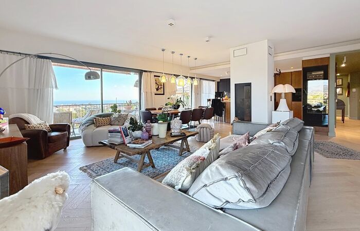Dernier Etage - 5 Pièces - Résidence de standing avec tennis et piscine - Fabron Situé sur les hauteurs de Fabron, au dernier étage d’une résidence de grand standing avec piscine et tennis, ce magnifique appartement d’angle et traversant de 5 pièces d'une surface de 141 m² s’ouvre sur une vaste terrasse d’angle de 70 m² offrant une superbe vue dégagée sur la mer, les montagnes et les jardins de la copropriété, dans un environnement calme et privilégié.