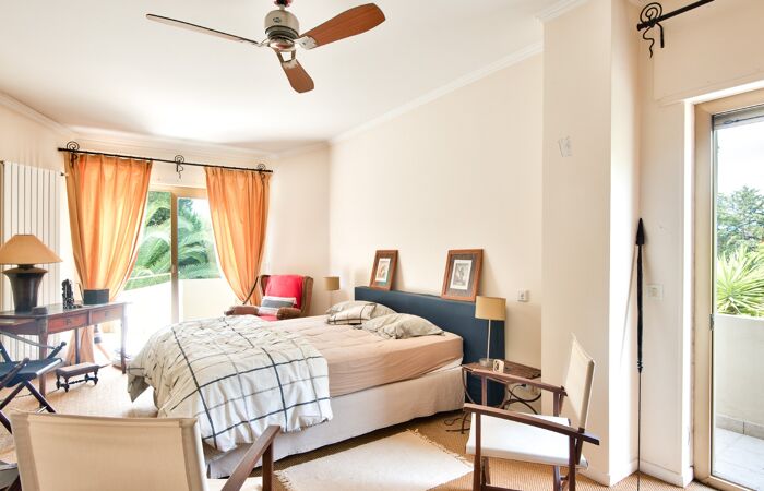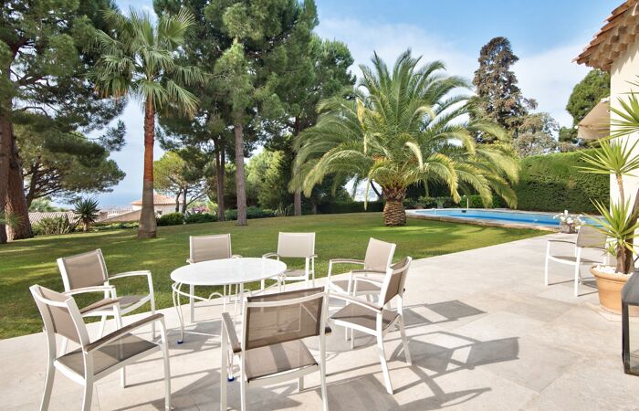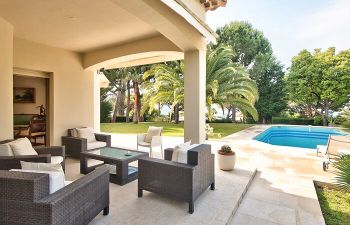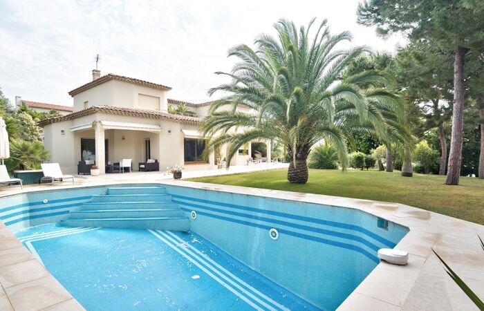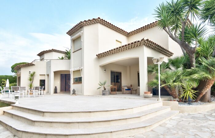 Idéalement située au cœur d'un domaine prisé et sécurisé, cette villa d'architecte moderne et spacieuse vous séduira par son cadre paisible et ses prestations de qualité. Édifiée sur un terrain plat et paysagé de 1 980 m², elle offre une belle vue sur la mer ainsi qu'une piscine entourée de verdure.