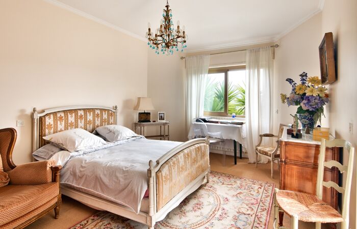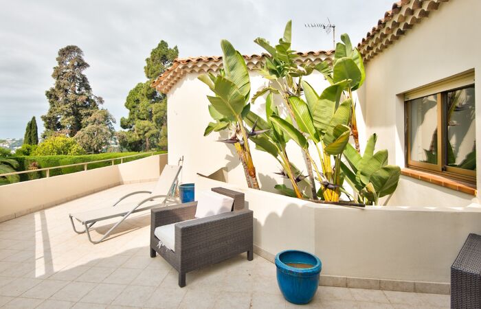 À l'étage, trois chambres, deux salles de bains et wc donnant accès à une magnifique terrasse solarium avec vue panoramique sur la mer