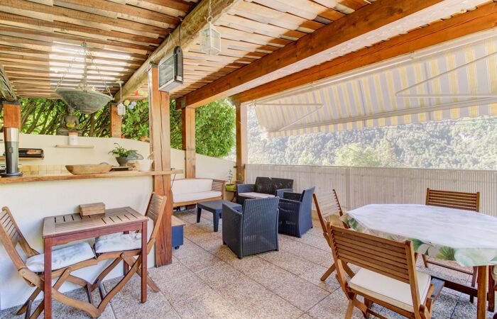 Vous serez séduit par sa décoration et son environnement exceptionnel. En effet la maison principale se compose de plain pied d'une terrasse ensoleillée, d'une lumineuse pièce de vie avec une cheminée de type insert, d'une cuisine ouverte, de trois chambres d'une salle d'eau et d'un W.C. Au rez de jardin sont à votre disposition une deuxième salle d'eau ainsi qu'un autre toilette. Avec son accès indépendant un studio d'environ 44 m² avec cuisine Américaine, salle de bain avec W.C est à votre disposition. Toujours sur ce même niveau, un grand garage complétera votre confort.