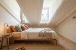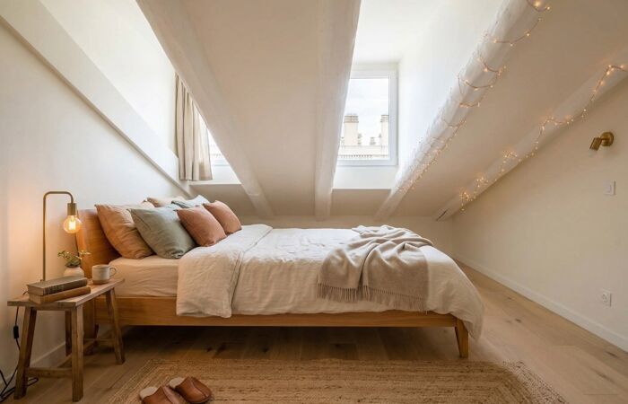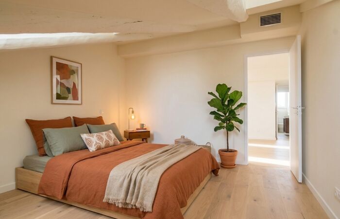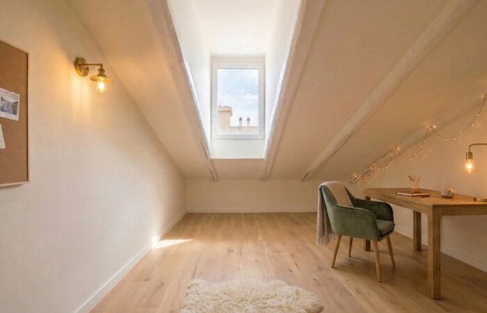 Il se compose d'un espace de vie avec cuisine américaine aménagée et équipée de 2 chambres légèrement mansardées et d'une troisième chambre /bureau, une SDE avec WC. Appartement entièrement rénové et climatisé. Immeuble très bien entretenu. Charges faibles.