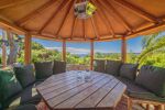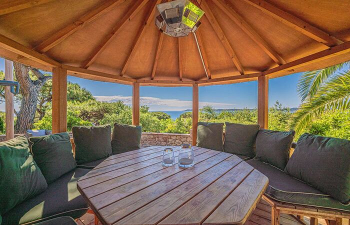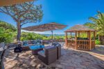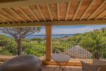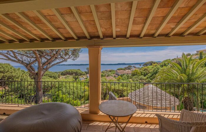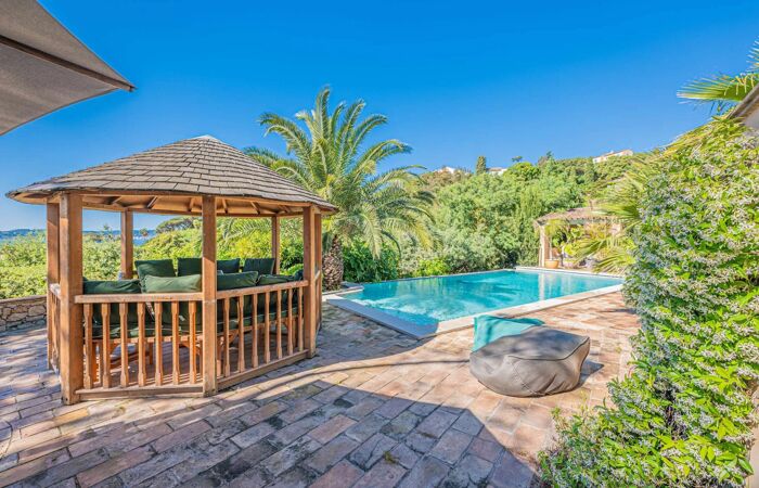 A l'extérieur : un jardin au charme exotique propice au repos et coin de lecture. Une piscine avec une vue mer imprenable sur le Golfe de Saint Tropez.