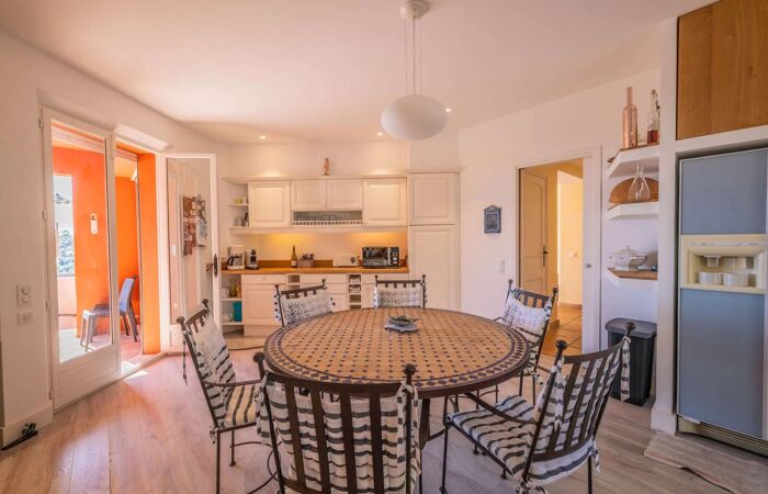 À lextérieur, profitez pleinement de la douceur de vivre méditerranéenne : piscine à débordement, large terrasse aménagée et espace repas ombragé invitent à la détente face au paysage.