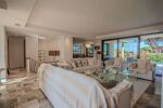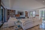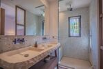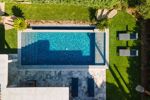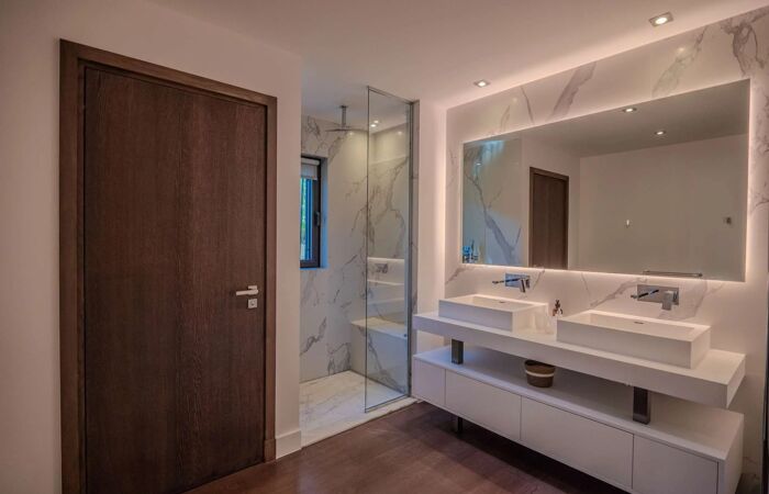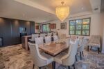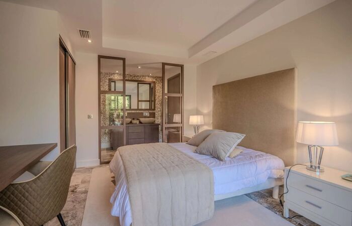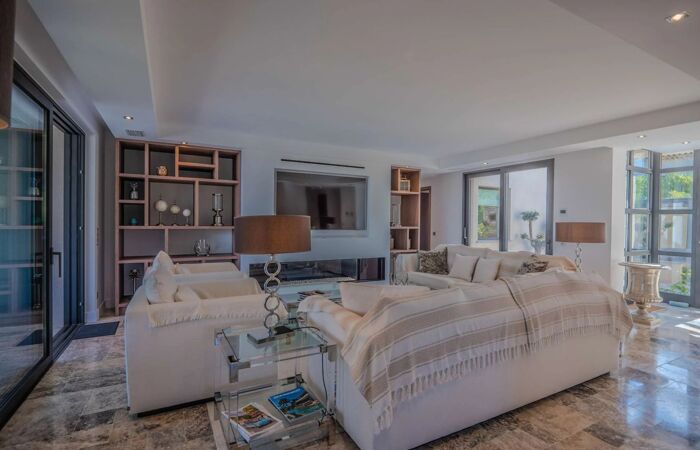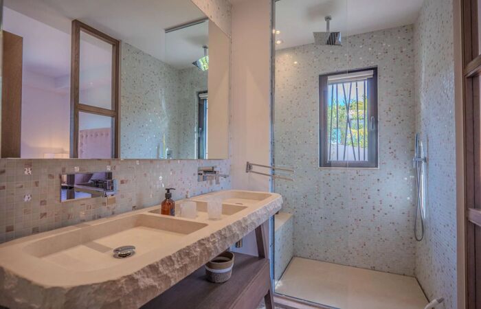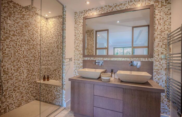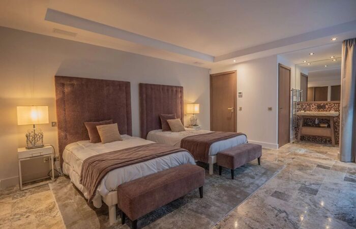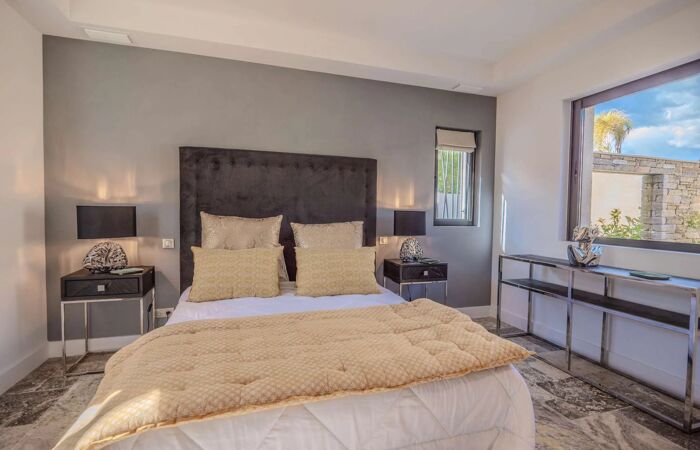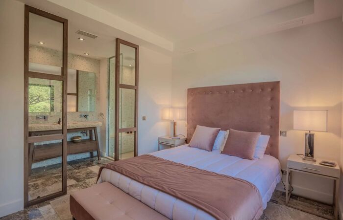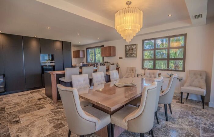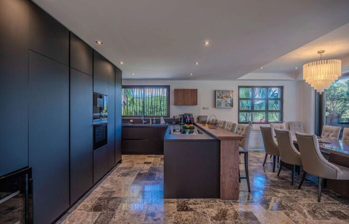 Elle se compose dun vaste espace de vie lumineux avec salon, cheminée, salle à manger et cuisine américaine entièrement équipée avec chambre froide. La villa offre cinq superbes chambres en suite chacune avec sa propre salle deau, dressing et WC, réparties entre le rez-de-chaussée et le niveau inférieur.