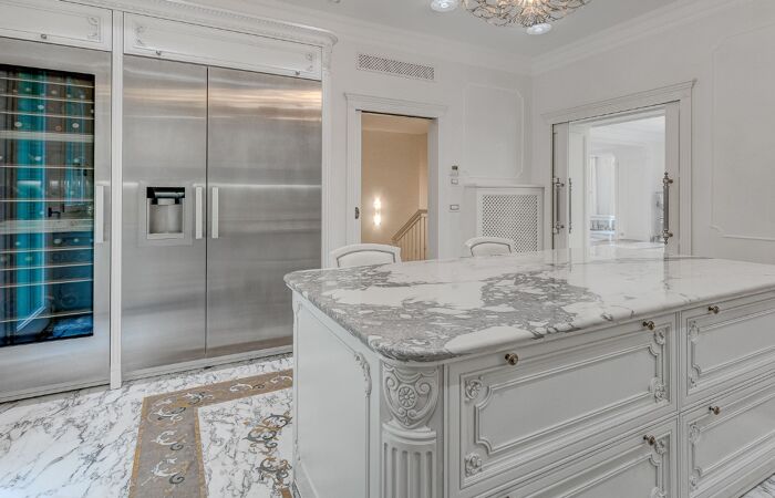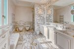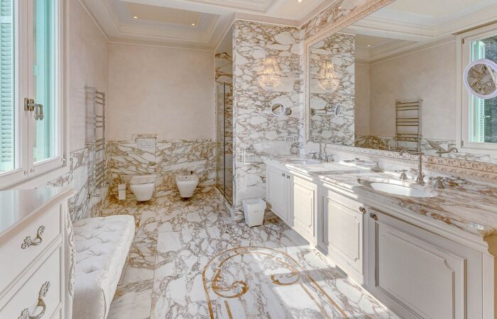 Cette propriété exceptionnelle présente des sols et des murs en marbre de qualité supérieure, ainsi que des planchers chauffants en bois dans les chambres supérieures.