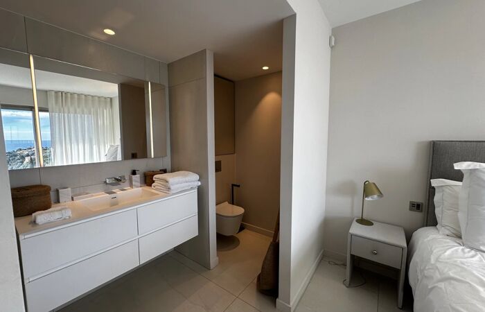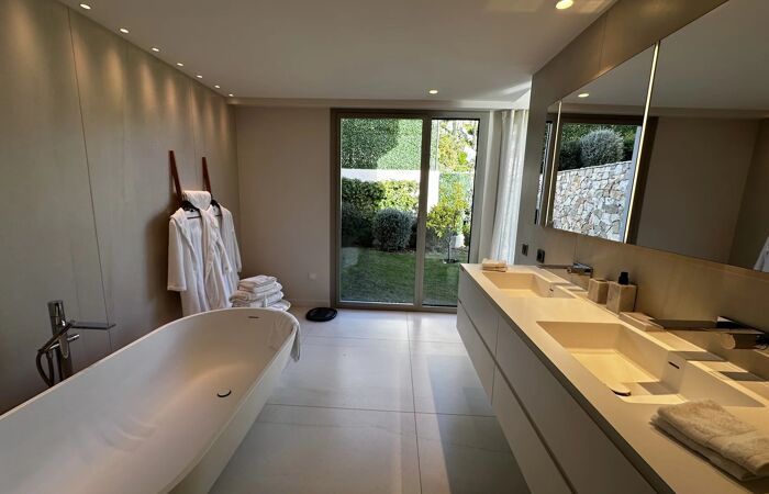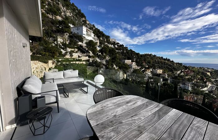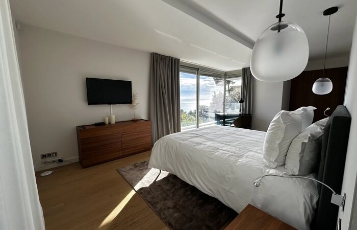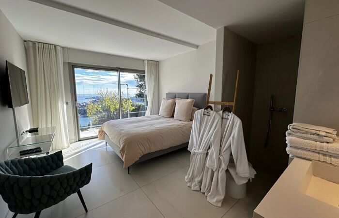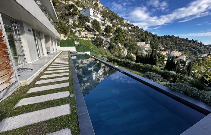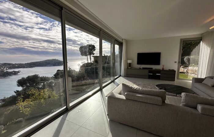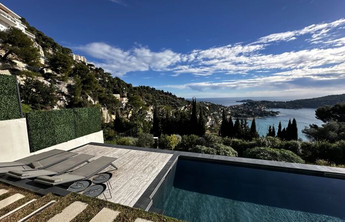 VILLEFRANCHE-SUR-MER - VILLA Une magnifique Villa de 360 m2 à Villefranche-sur-mer avec une vue mer sur Saint-Jean-Cap-Ferrat et la rade de Villefranche. Un grand séjour lumineux avec une cuisine ouverte donnant sur une grande terrasse de 30 m2. Une chambre avec sa buanderie et sa salle de bain. 4 chambres au rez-de-jardin, chacune avec sa propre salle de bain et une ouverture donnant sur la piscine. Un hammam, un pool house. Grande piscine avec sa plage et son salon très agréable. Un appartement de 48m2 pour le personnel de maison complète ce bien. Ainsi que 4 places de stationnement.