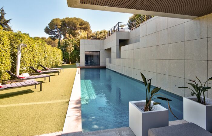 À l'extérieur, un jardin méditerranéen paysager entoure la villa et accueille une piscine chauffée de 15 mètres par 5 mètres, dotée d'un système de filtration sans chlore. Un garage avec accès direct à la maison ainsi que des places de stationnement pour 8 voitures complètent cette propriété.