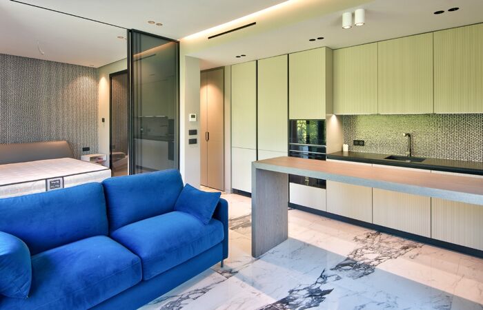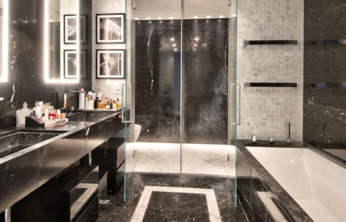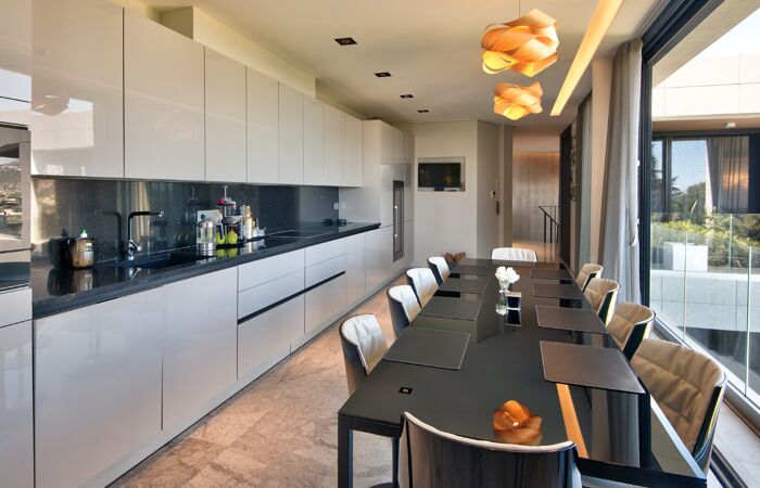 Conçue avec des matériaux d'exception tels que le marbre de Carrare, les portes Lualdi, les dressings Poliform et la cuisine SIEMATIC/GAGGENAU, cette propriété s'étend sur deux niveaux et propose des prestations haut de gamme. Double séjour très lumineux offrant une magnifique vue sur la mer, cuisine indépendante avec salle à manger, suite parentale avec dressings et salle de bains, trois chambres offrant un accès direct à de vastes terrasses et un espace bien-être incluant un spa, un hammam, un sauna et une douche. Une buanderie et une cave à vin complètent ce niveau.