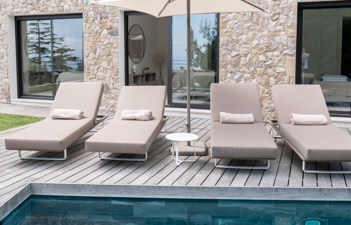 Prestations haut de gamme, climatisation, ascenseur, piscine chauffée, salle de sport avec jacuzzi, terrain de boules, terrasses à chaque étage et vue mer à tous les étages.