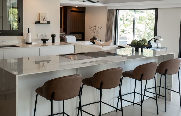 - au premier étage : un double séjour avec cuisine américaine équipée, un WC invité, une chambre avec salle d'eau, et une chambre de service avec entrée indépendante.