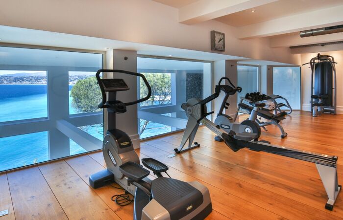 Un espace détente au niveau supérieur avec piscine intérieure, spa, jacuzzi, salle de fitness, cuisine d'été, chambre avec balcon et salle de bains.