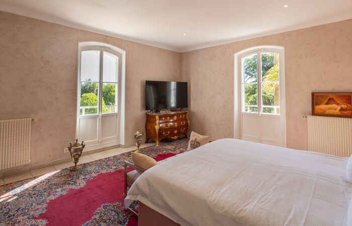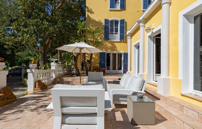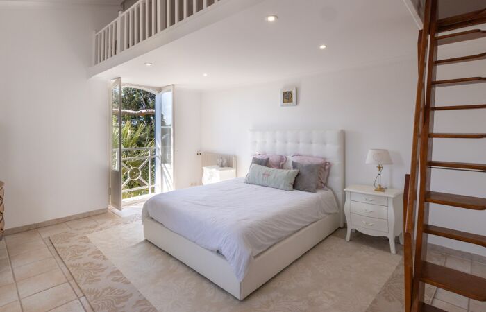 La propriété, d'une superficie d'environ 350 m² répartis sur trois niveaux, se compose de : Un vaste séjour lumineux avec salle à manger, une cuisine entièrement équipée, cinq suites avec salle de bains ou salle de douche privative, un bureau ou un espace bibliothèque. À l'extérieur, nombreuses terrasses offrant différentes ambiances ainsi qu'une superbe piscine chauffée avec vue imprenable sur la mer.
