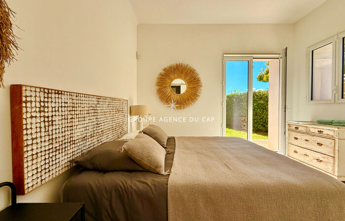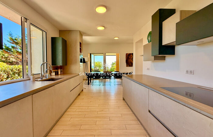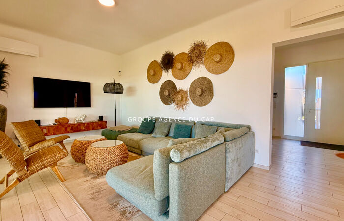 À l'horizon, la Méditerranée scintille. Juste en face, la baie de Saint-Tropez. C'est dans ce décor unique que se niche cette villa contemporaine, véritable écrin de quiétude, offrant un accès direct à la plage et une vue panoramique à couper le souffle.