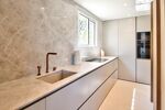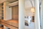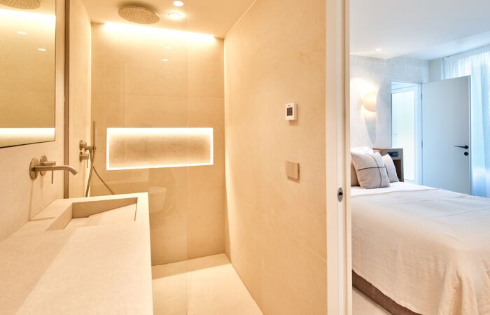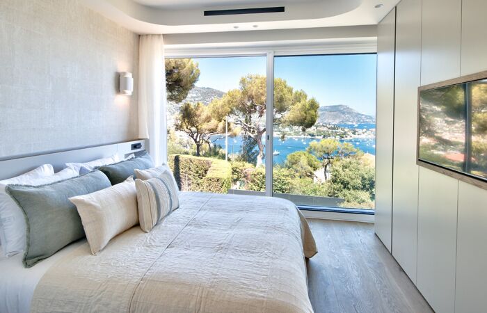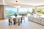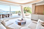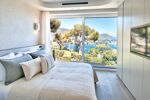 Au niveau principal, un vaste séjour lumineux s'ouvrant sur une grande terrasse et une piscine avec superbe vue panoramique sur la mer, une cuisine haut de gamme, deux chambres en suite, dont une avec salle de bain, ainsi qu'un WC invité.
