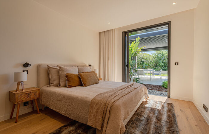 Au rez-de-jardin, un vaste espace de vie s'ouvre sur la terrasse et la piscine à débordement, comprenant un salon spacieux, une salle à manger conviviale et une cuisine moderne aux finitions raffinées.