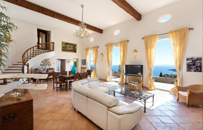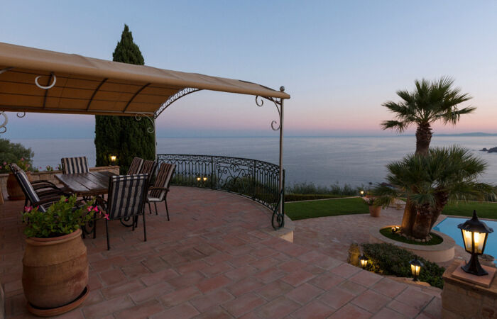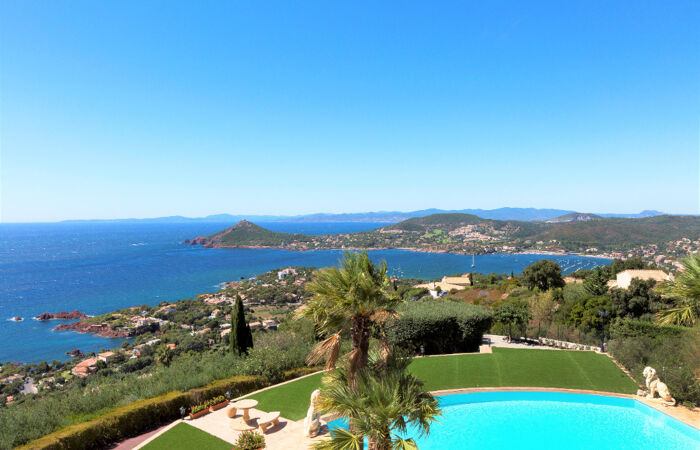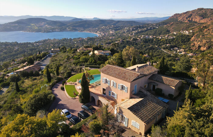 Dominant la rade d'Agay, cette exceptionnelle propriété nichée au sommet d'un domaine privé bénéficie d'une vue panoramique sur la Mer jusqu'à Saint-Tropez et sur l'Esterel. Elle est composée d'une villa principale de 7 pièces avec un séjour de plus de 80m2, 5 spacieuses suites, une grande cuisine et des terrasses baignées de soleil. La propriété dispose également d'une villa annexe de 3 pièces avec jardin. Implantée sur un terrain de 3100m2 la villa profite d'une confortable piscine à débordement mais également de 3 garages et de plusieurs de dépendances. Le magnifique panorama qui est offert, est sans doute l'un des plus incroyables de la région. A seulement 1h de l'aéroport de Nice et proche de Cannes et Saint-Tropez, cette superbe demeure au calme absolu est une pièce unique en son genre !