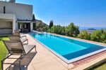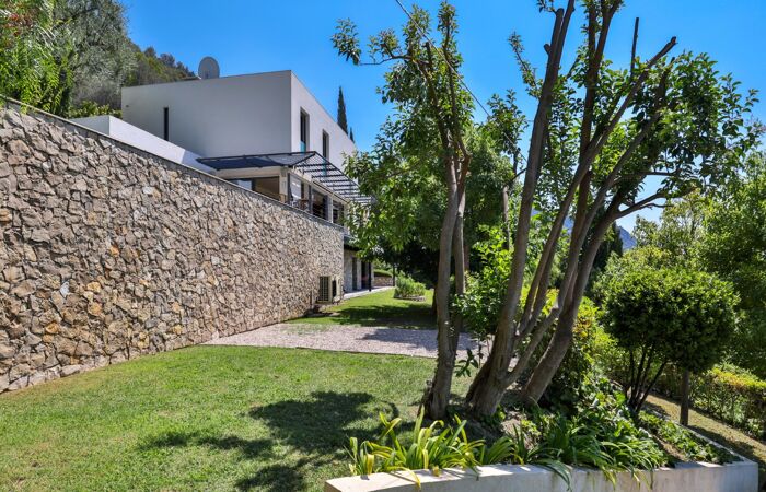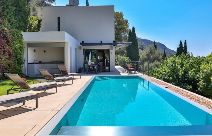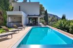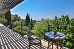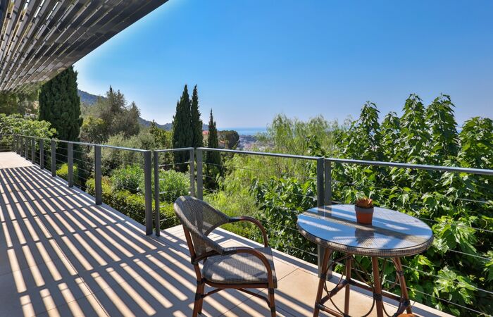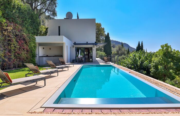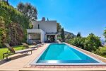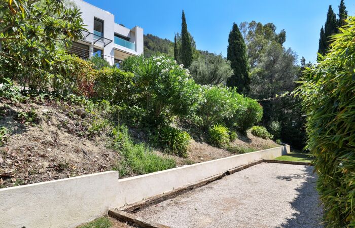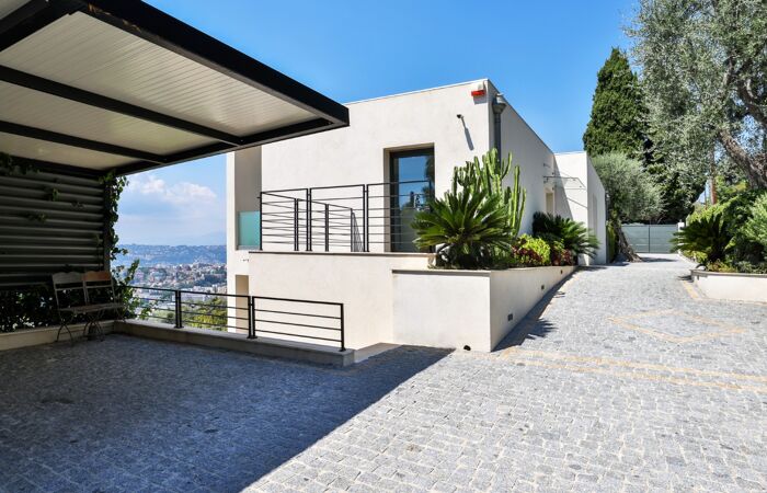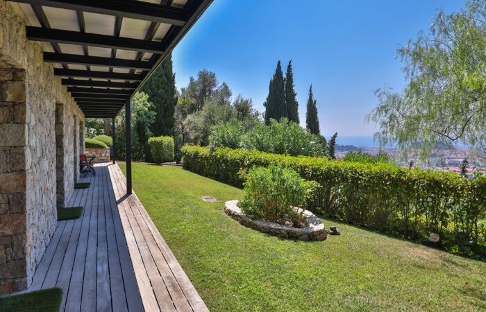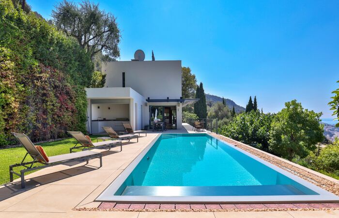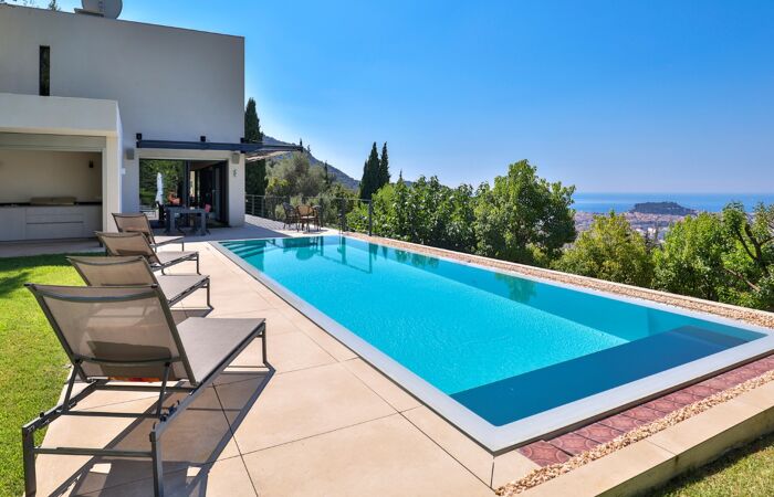 Nice Grande Corniche/Vinaigrier : Edifiée sur un terrain arboré de 1700 m², superbe villa rénovée aux prestations luxueuses. Cette propriété jouit d'une très belle vue panoramique sur la baie des anges et bénéficie d'une piscine chauffée à débordement avec poolhouse et d'un boulodrome.